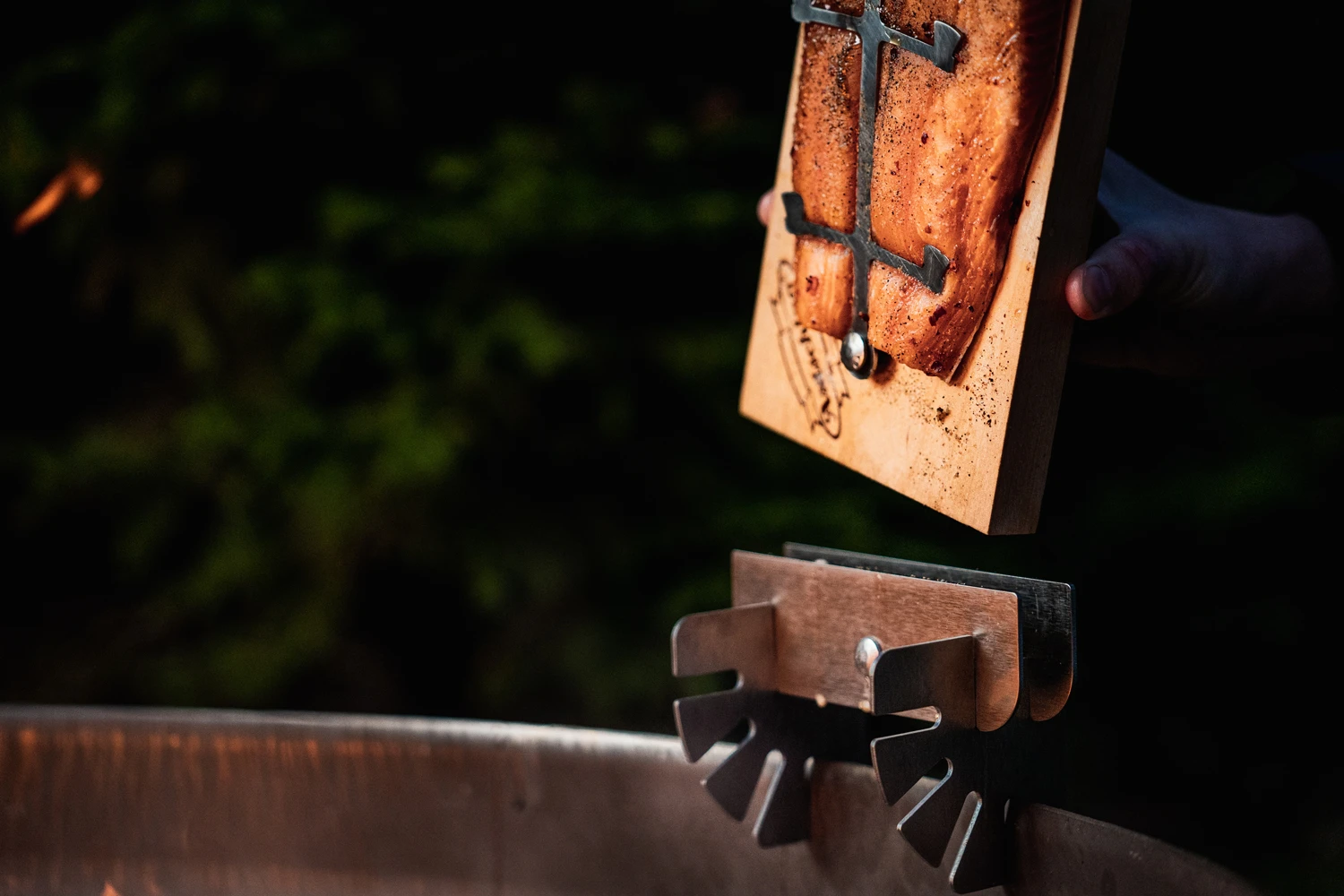 Der Lachs ist nun fertig vorbereitet und kann an der Feuerstelle platziert werden. Dazu den Haltbügel am Rand der Feuerschale im gewünschten Winkel befestigen. Jetzt muss nur noch das Brett mit der Lachsaite eingeklemmt werden.