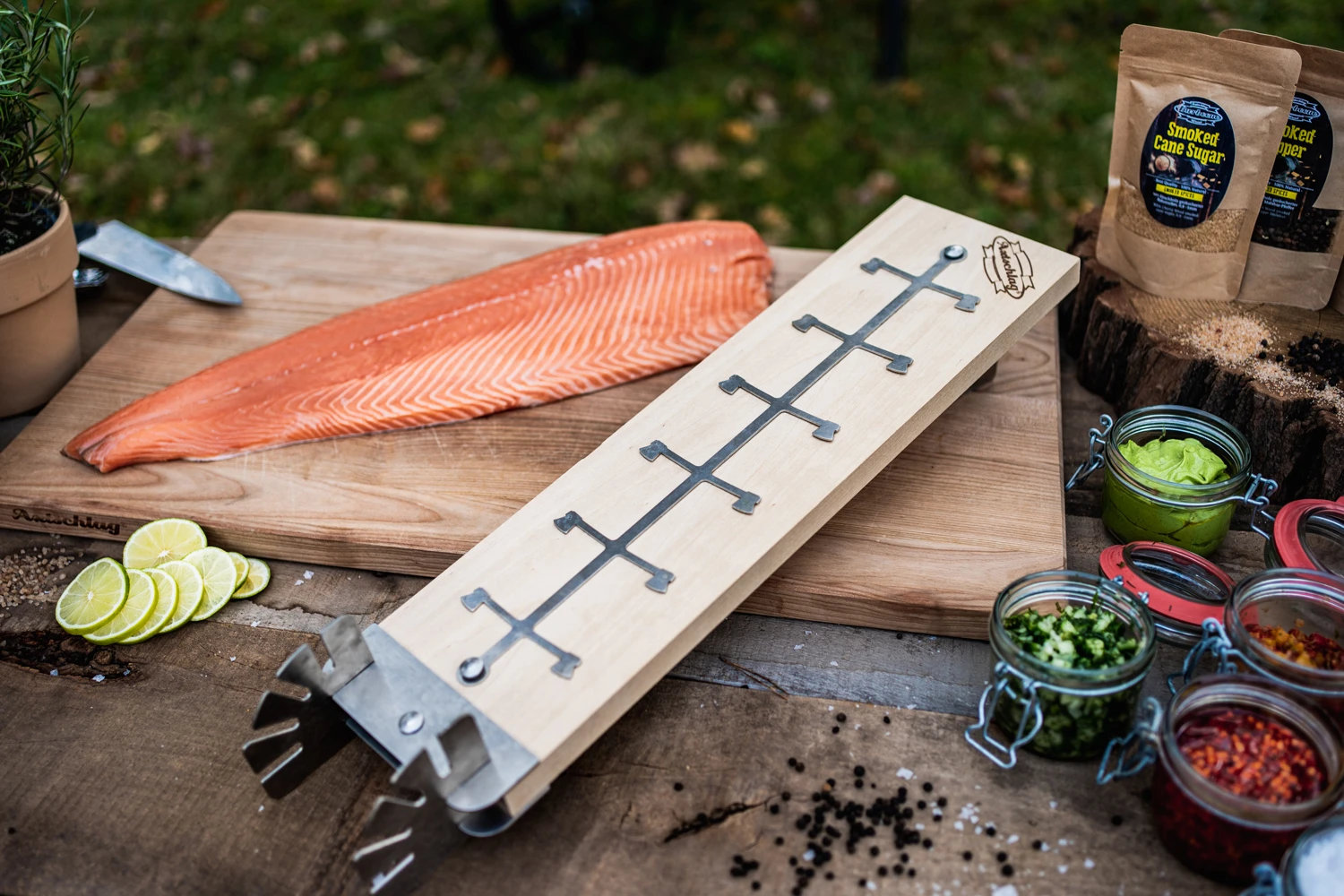 Mit dem Axtschlag Flammlachsbrett kommt jeder Grillmeister, ob mit Feuertonne oder Feuerschale, in den Genuß von perfekt zubereitetem leckeren Flammlachs.
