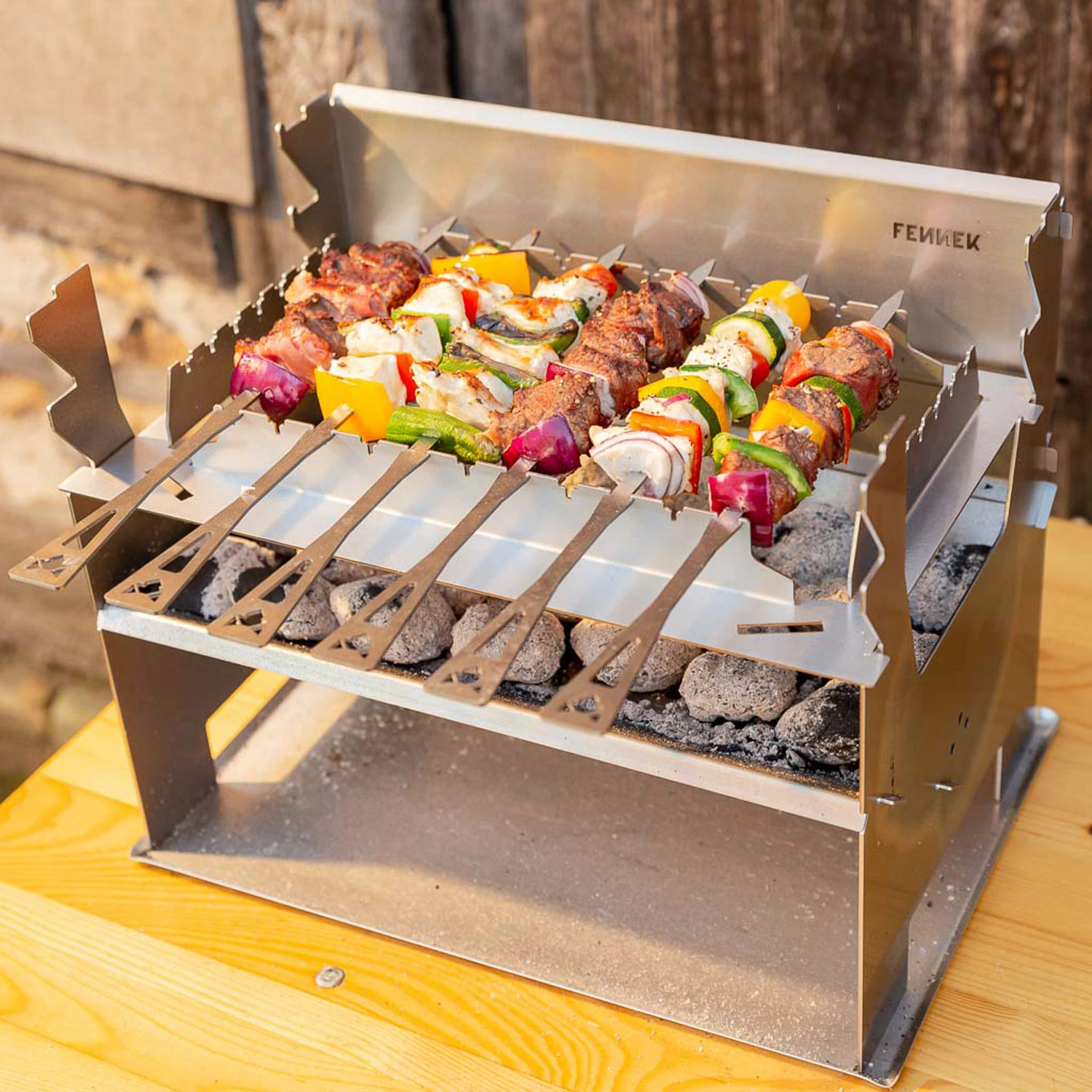 Erweitern Sie Ihren Fennek Grill 2.0 mit der passenden Spießhalterung und bereiten Sie köstliche Grillspieße und Schaschlikspieße zu.