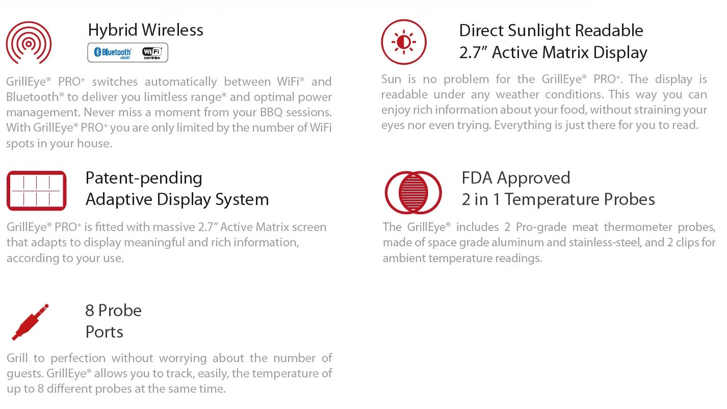 Das GrillEye Pro Plus bietet damit innovative und besonders praktische Neuerung zur Umsetzung einer lückenlosen und bequemen Überwachung Ihres Grillguts.