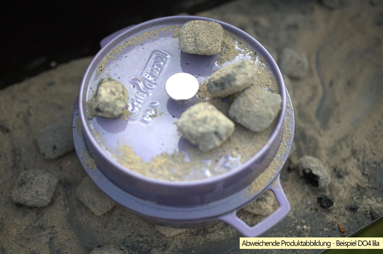 Wer das Spiel mit dem Feuer nicht missen möchte, kann den Dutch Oven ohne Füße selbstverständlich auch traditionell mit Briketts befeuern. Hierfür ist ein zusätzlicher Feuerrost notwendig, damit die Briketts unter dem Topf platziert werden können.