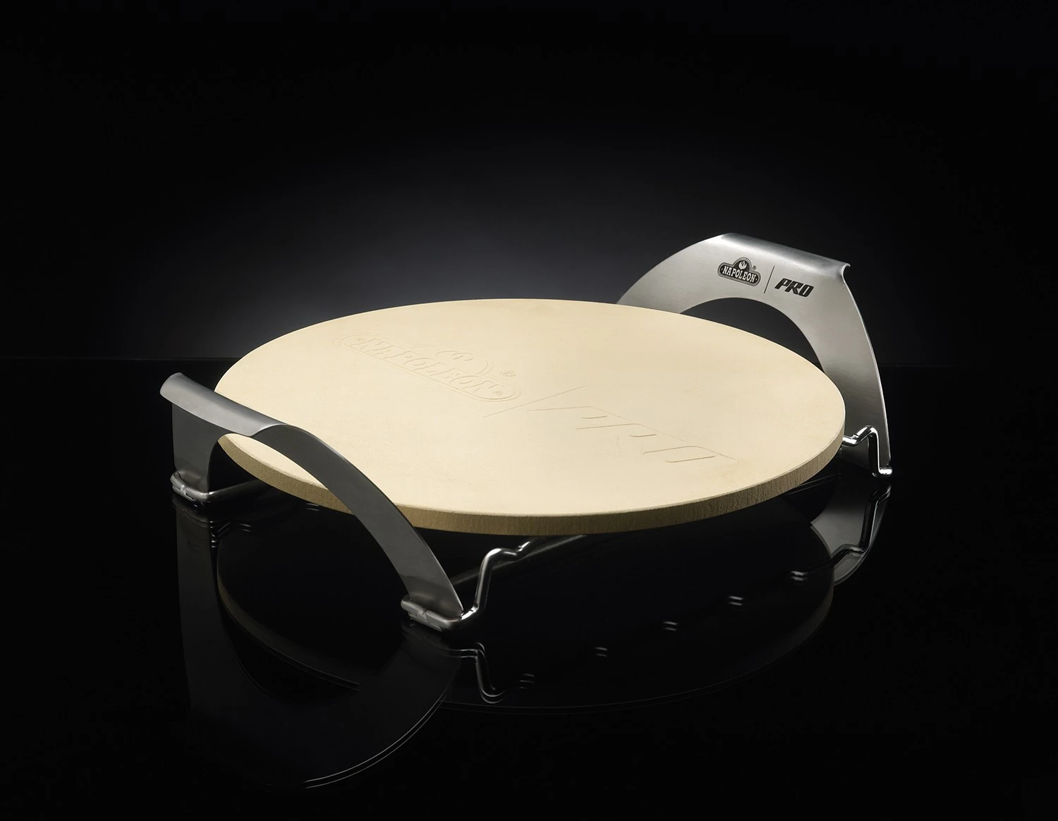 Der tolle Napoleon PRO Pizzastein mit Halterung und Spießen für knusprige Pizzen oder leckere Spieße.