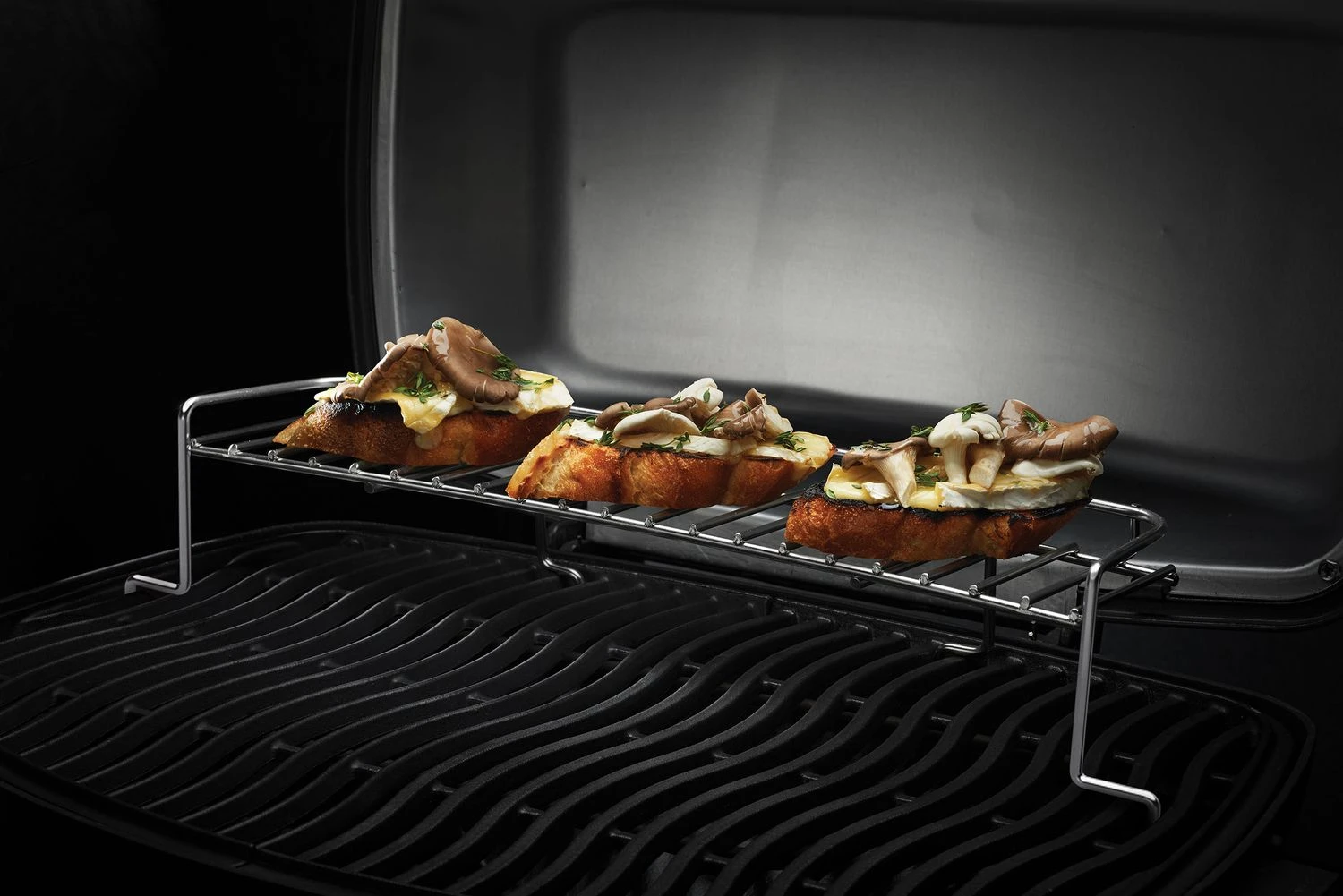 Auf dem Warmhalterost garen Beilagen wie Kartoffeln, Gemüse oder Baguette besonders schonend, da die Temperatur im oberen Bereich des Deckels etwas niedriger ist als direkt auf Grillrosthöhe.