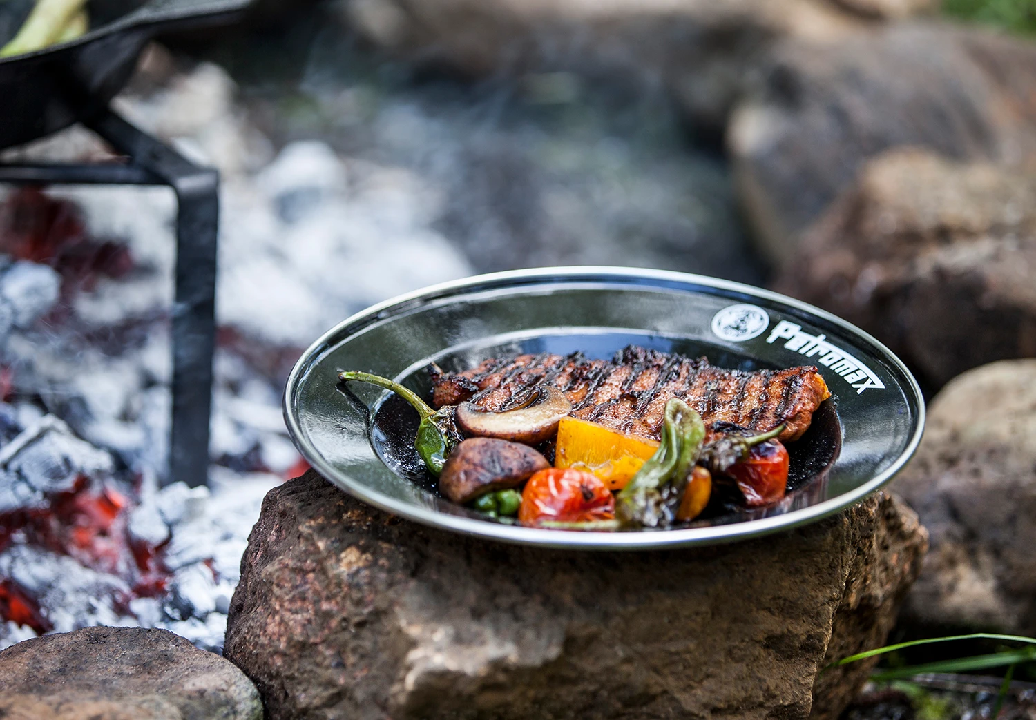 Die gebrannte, glatte Oberfläche ist unempfindlich gegen Kratzer und lässt sich auch unterwegs leicht reinigen. Der Edelstahlrand verleiht den Tellern nicht nur ein hochwertiges Aussehen, sondern schützt die Emaille auch vor Abplatzungen.