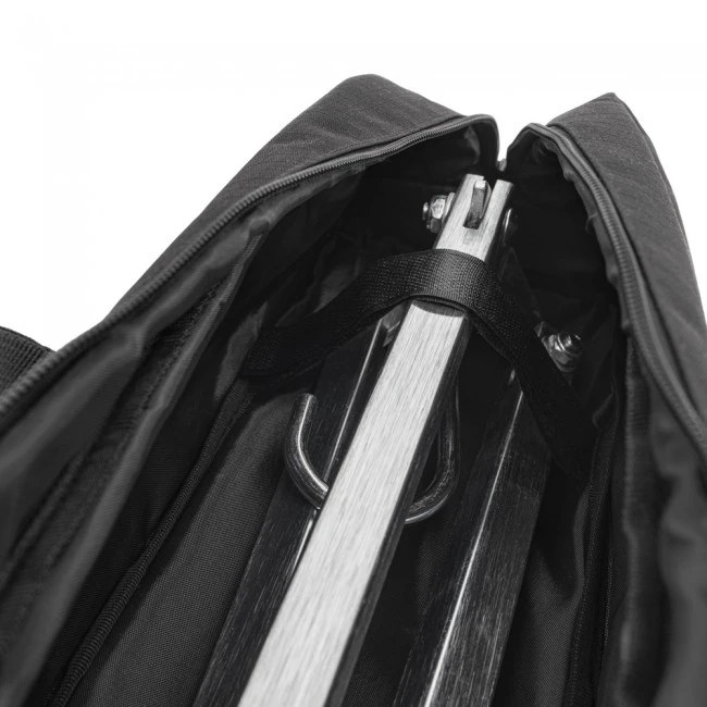 Dank des robusten Ripstop-Gewebe, dem verstärkte Boden und der Klett-Fixierung ist das Dreibein mit seinen spitz zulaufenden Füßen in der Tasche sicher verstaut. So können sie es an den mit Leder verstärkten Tragegriffen bequem über der Schulter tragen. Zubehör wie Kette und Haken findet in der Außentasche reichlich Platz.