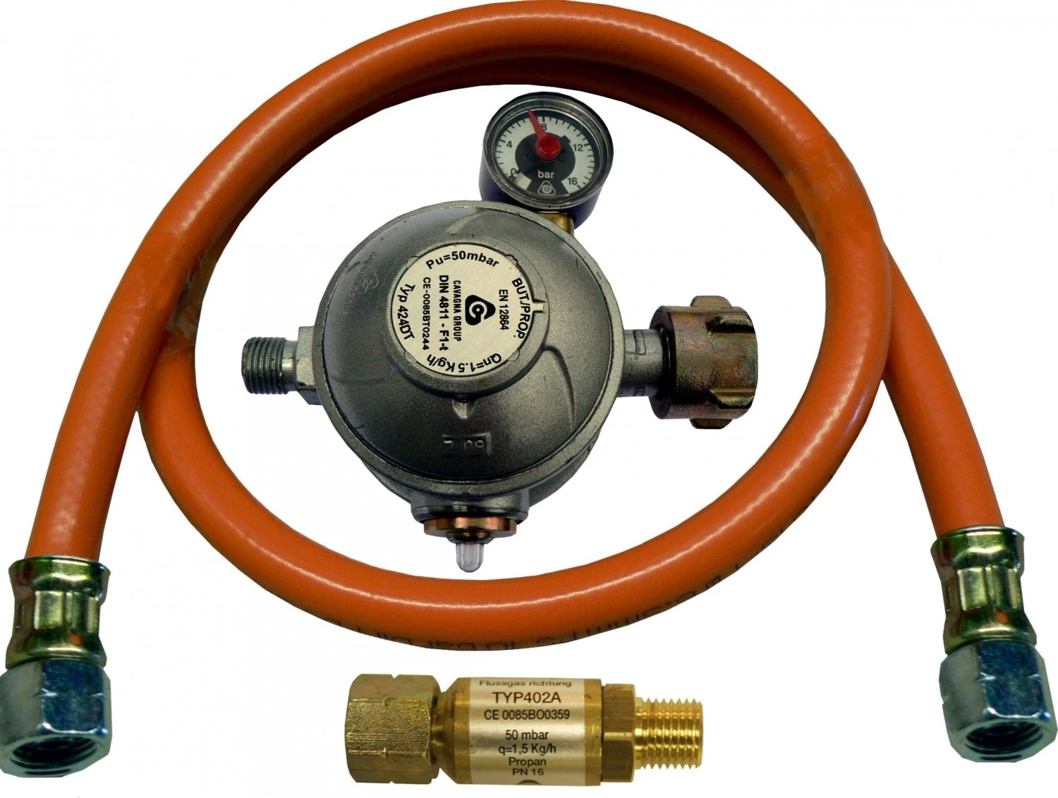 1 zweistufiger Sicherheits-Druckminderer (GW-Regler) mit thermischer Absperrung und Manometer, 1 Schlauchbruchsicherung und 1 Gasschlauch